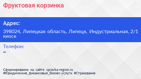 Фруктовая корзинка по адресу 398024, Липецкая область, Липецк, Индустриальная, 2/1 киоск в дальнейшем Организация, размещена в следующих категориях: