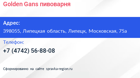 Golden Gans, пивоварня по адресу 398055, Липецкая область, Липецк, Московская, 75а в дальнейшем Организация, размещена в следующих категориях: