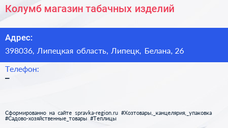 Колумб, магазин табачных изделий по адресу 398036, Липецкая область, Липецк, Белана, 26 в дальнейшем Организация, размещена в следующих категориях: