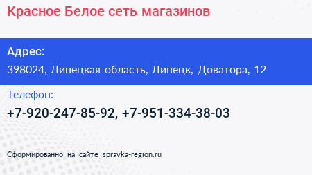 Красное & Белое, сеть магазинов по адресу 398024, Липецкая область, Липецк, Доватора, 12 в дальнейшем Организация, размещена в следующих категориях: