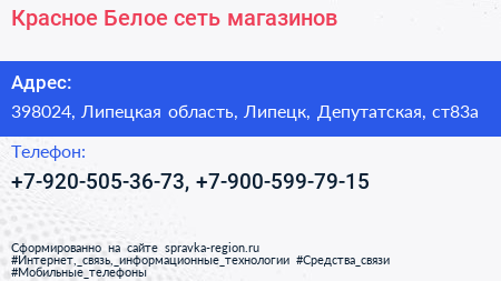 Красное & Белое, сеть магазинов по адресу 398024, Липецкая область, Липецк, Депутатская, ст83а в дальнейшем Организация, размещена в следующих категориях: