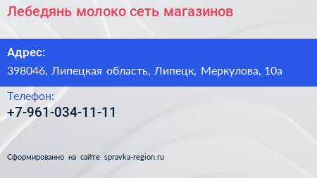 Лебедянь молоко, сеть магазинов по адресу 398046, Липецкая область, Липецк, Меркулова, 10а в дальнейшем Организация, размещена в следующих категориях: