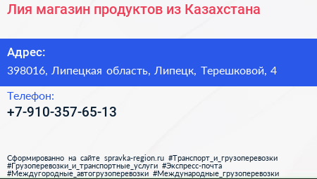Лия, магазин продуктов из Казахстана по адресу 398016, Липецкая область, Липецк, Терешковой, 4 в дальнейшем Организация, размещена в следующих категориях: