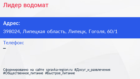 Лидер, водомат по адресу 398024, Липецкая область, Липецк, Гоголя, 60/1 в дальнейшем Организация, размещена в следующих категориях: