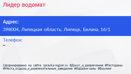 Лидер, водомат по адресу 398004, Липецкая область, Липецк, Белана, 16/1 в дальнейшем Организация, размещена в следующих категориях: