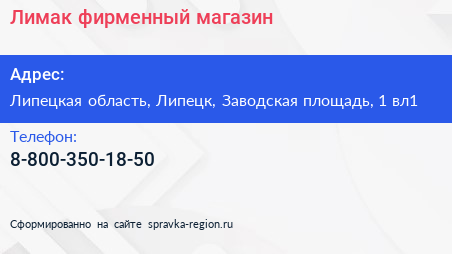 Лимак, фирменный магазин по адресу Липецкая область, Липецк, Заводская площадь, 1 вл1 в дальнейшем Организация, размещена в следующих категориях: