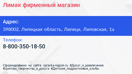 Лимак, фирменный магазин по адресу 398002, Липецкая область, Липецк, Липовская, 1а в дальнейшем Организация, размещена в следующих категориях: