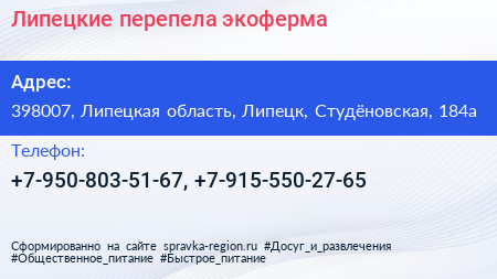 Липецкие перепела, экоферма по адресу 398007, Липецкая область, Липецк, Студёновская, 184а в дальнейшем Организация, размещена в следующих категориях: