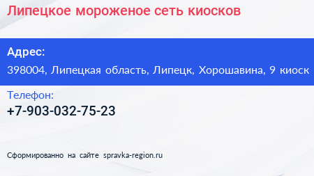 Липецкое мороженое, сеть киосков по адресу 398004, Липецкая область, Липецк, Хорошавина, 9 киоск в дальнейшем Организация, размещена в следующих категориях: