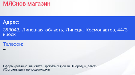 МЯСнов, магазин по адресу 398043, Липецкая область, Липецк, Космонавтов, 44/3 киоск в дальнейшем Организация, размещена в следующих категориях:
