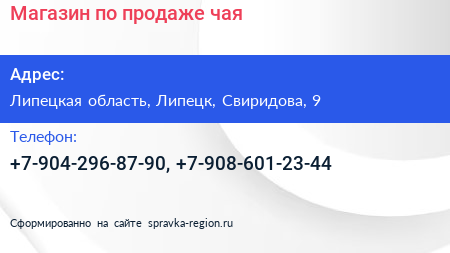 Магазин по продаже чая по адресу Липецкая область, Липецк, Свиридова, 9 в дальнейшем Организация, размещена в следующих категориях: