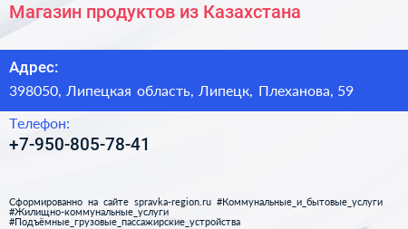 Магазин продуктов из Казахстана по адресу 398050, Липецкая область, Липецк, Плеханова, 59 в дальнейшем Организация, размещена в следующих категориях: