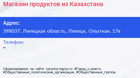 Магазин продуктов из Казахстана по адресу 398037, Липецкая область, Липецк, Опытная, 17в в дальнейшем Организация, размещена в следующих категориях: