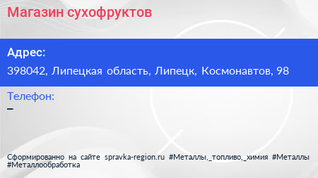 Магазин сухофруктов по адресу 398042, Липецкая область, Липецк, Космонавтов, 98 в дальнейшем Организация, размещена в следующих категориях:
