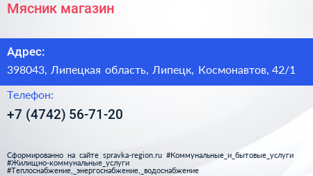 Мясник, магазин по адресу 398043, Липецкая область, Липецк, Космонавтов, 42/1 в дальнейшем Организация, размещена в следующих категориях: