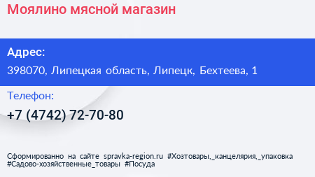Моялино, мясной магазин по адресу 398070, Липецкая область, Липецк, Бехтеева, 1 в дальнейшем Организация, размещена в следующих категориях: