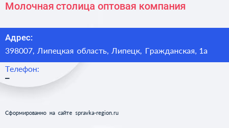 Молочная столица, оптовая компания по адресу 398007, Липецкая область, Липецк, Гражданская, 1а в дальнейшем Организация, размещена в следующих категориях: