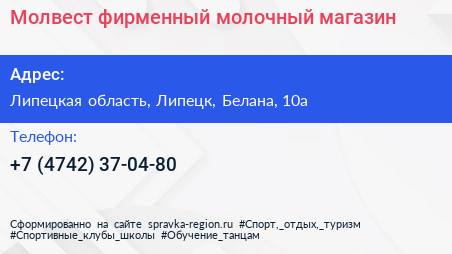 Молвест, фирменный молочный магазин по адресу Липецкая область, Липецк, Белана, 10а в дальнейшем Организация, размещена в следующих категориях: