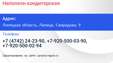Наполеон, кондитерская по адресу Липецкая область, Липецк, Свиридова, 9 в дальнейшем Организация, размещена в следующих категориях: