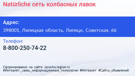 Natürliche, сеть колбасных лавок по адресу 398001, Липецкая область, Липецк, Советская, 66 в дальнейшем Организация, размещена в следующих категориях: