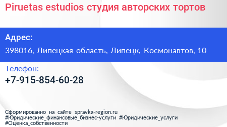 Piruetas estudios, студия авторских тортов по адресу 398016, Липецкая область, Липецк, Космонавтов, 10 в дальнейшем Организация, размещена в следующих категориях: