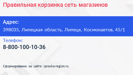 Правильная корзинка, сеть магазинов по адресу 398035, Липецкая область, Липецк, Космонавтов, 45/1 в дальнейшем Организация, размещена в следующих категориях:
