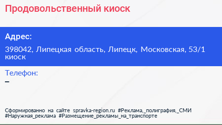 Продовольственный киоск по адресу 398042, Липецкая область, Липецк, Московская, 53/1 киоск в дальнейшем Организация, размещена в следующих категориях: