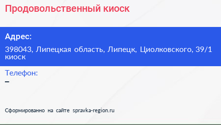 Продовольственный киоск по адресу 398043, Липецкая область, Липецк, Циолковского, 39/1 киоск в дальнейшем Организация, размещена в следующих категориях: