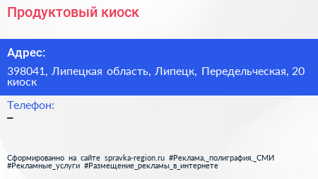 Продуктовый киоск по адресу 398041, Липецкая область, Липецк, Передельческая, 20 киоск в дальнейшем Организация, размещена в следующих категориях: