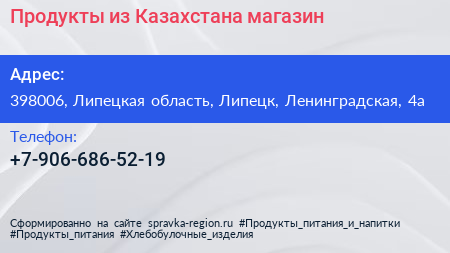Продукты из Казахстана, магазин по адресу 398006, Липецкая область, Липецк, Ленинградская, 4а в дальнейшем Организация, размещена в следующих категориях: