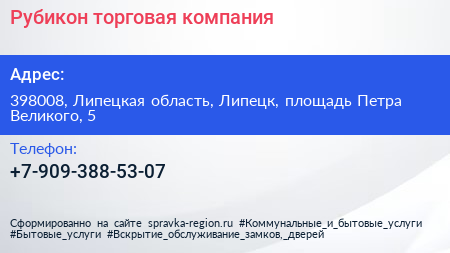 Рубикон, торговая компания по адресу 398008, Липецкая область, Липецк, площадь Петра Великого, 5 в дальнейшем Организация, размещена в следующих категориях: