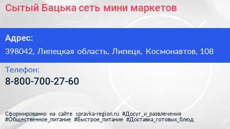 Сытый Бацька, сеть мини-маркетов по адресу 398042, Липецкая область, Липецк, Космонавтов, 108 в дальнейшем Организация, размещена в следующих категориях:
