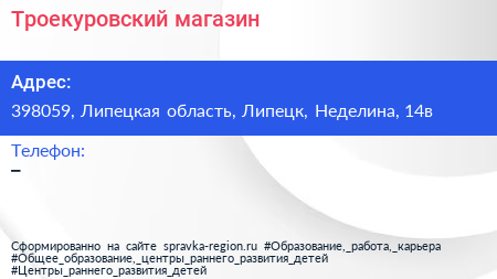 Троекуровский, магазин по адресу 398059, Липецкая область, Липецк, Неделина, 14в в дальнейшем Организация, размещена в следующих категориях: