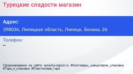 Турецкие сладости, магазин по адресу 398036, Липецкая область, Липецк, Белана, 26 в дальнейшем Организация, размещена в следующих категориях:
