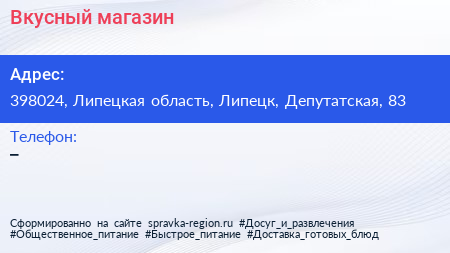 Вкусный, магазин по адресу 398024, Липецкая область, Липецк, Депутатская, 83 в дальнейшем Организация, размещена в следующих категориях: