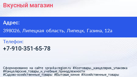 Вкусный, магазин по адресу 398026, Липецкая область, Липецк, Газина, 12а в дальнейшем Организация, размещена в следующих категориях: