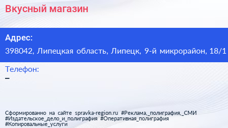 Вкусный, магазин по адресу 398042, Липецкая область, Липецк, 9-й микрорайон, 18/1 в дальнейшем Организация, размещена в следующих категориях: