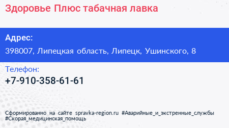 Здоровье Плюс, табачная лавка по адресу 398007, Липецкая область, Липецк, Ушинского, 8 в дальнейшем Организация, размещена в следующих категориях: