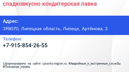 #сладковкусно, кондитерская лавка по адресу 398070, Липецкая область, Липецк, Артёмова, 3 в дальнейшем Организация, размещена в следующих категориях: