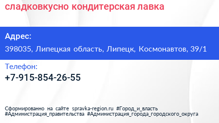 #сладковкусно, кондитерская лавка по адресу 398035, Липецкая область, Липецк, Космонавтов, 39/1 в дальнейшем Организация, размещена в следующих категориях: