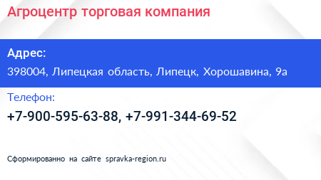 Агроцентр, торговая компания по адресу 398004, Липецкая область, Липецк, Хорошавина, 9а в дальнейшем Организация, размещена в следующих категориях: