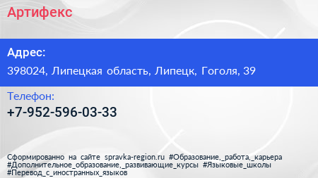 Артифекс по адресу 398024, Липецкая область, Липецк, Гоголя, 39 в дальнейшем Организация, размещена в следующих категориях: