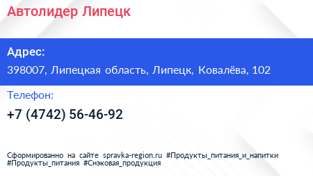 Автолидер Липецк по адресу 398007, Липецкая область, Липецк, Ковалёва, 102 в дальнейшем Организация, размещена в следующих категориях:
