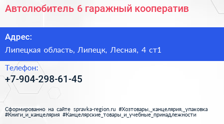 Автолюбитель-6, гаражный кооператив по адресу Липецкая область, Липецк, Лесная, 4 ст1 в дальнейшем Организация, размещена в следующих категориях:
