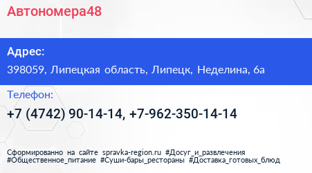Автономера48 по адресу 398059, Липецкая область, Липецк, Неделина, 6а в дальнейшем Организация, размещена в следующих категориях: