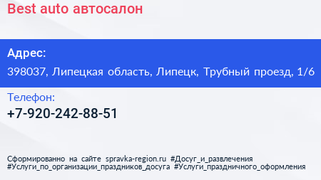 Best auto, автосалон по адресу 398037, Липецкая область, Липецк, Трубный проезд, 1/6 в дальнейшем Организация, размещена в следующих категориях: