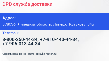 DPD, служба доставки по адресу 398036, Липецкая область, Липецк, Катукова, 34а в дальнейшем Организация, размещена в следующих категориях: