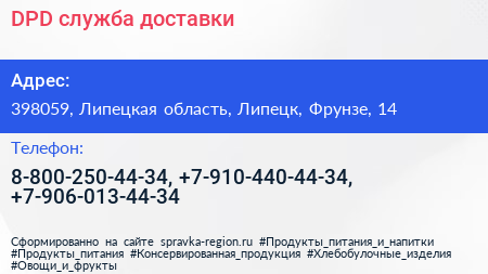 DPD, служба доставки по адресу 398059, Липецкая область, Липецк, Фрунзе, 14 в дальнейшем Организация, размещена в следующих категориях: