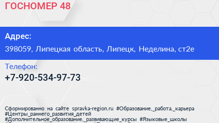 ГОСНОМЕР 48 по адресу 398059, Липецкая область, Липецк, Неделина, ст2е в дальнейшем Организация, размещена в следующих категориях: