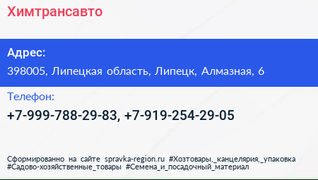 Химтрансавто по адресу 398005, Липецкая область, Липецк, Алмазная, 6 в дальнейшем Организация, размещена в следующих категориях: